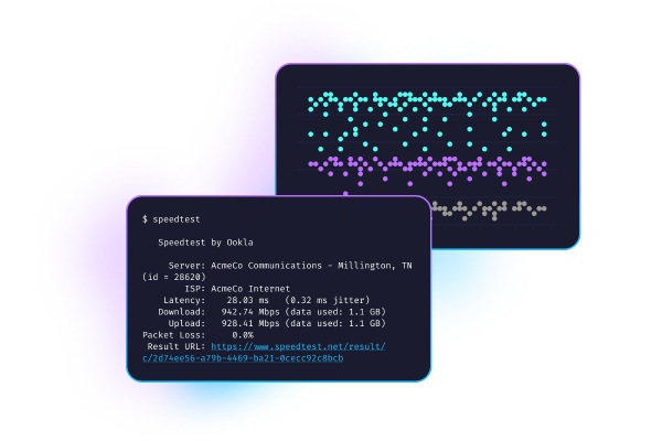 يُقدّم Speedtest CLI التقنية الموثوقة وشبكة الخادم العالمية وراء Speedtest إلى سطر الأوامر. Speedtest CLIهو أول تطبيق Speedtest رسمي مستند إلى Linux ومدعوم من Ookla®، وقد أنشيء لمطوري البرامج ومديري الأنظمة وهواة الكمبيوتر على حد سواء.